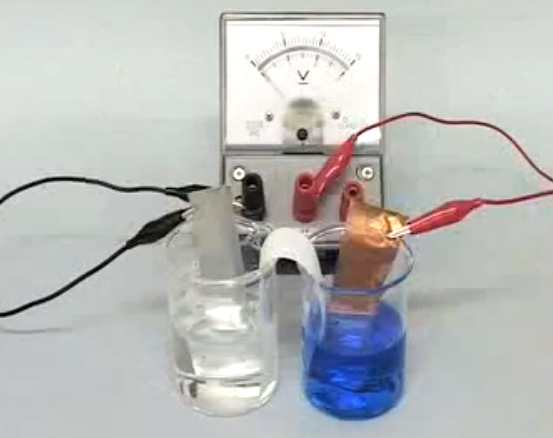 Connect the zinc and copper plates to the zero-centered ammeter and observe the ammeter.