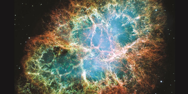 The Crab Nebula consists of remnants of a supernova (the explosion of a star). NASA’s Hubble Space Telescope produced this composite image. Measurements of the emitted light wavelengths enabled astronomers to identify the elements in the nebula, determining that it contains specific ions including S+ (green filaments) and O2+ (red filaments). Image credit: modification of work by NASA and ESA