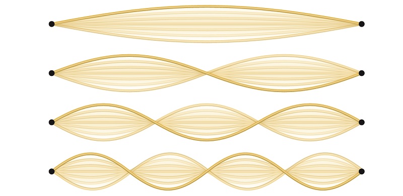 A vibrating string shows some one-dimensional standing waves. Since the two end points of the string are held fixed, only waves having an integer number of half-wavelengths can form. The points on the string between the end points that are not moving are called the nodes. Image credit: OpenStax, Chemistry