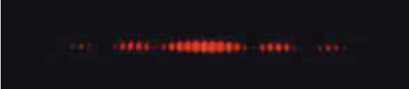 One particularly characteristic phenomenon of waves results when two or more waves come into contact: They interfere with each other. The image below shows the interference patterns that arise when light passes through narrow slits closely spaced about a wavelength apart. The fringe patterns produced depend on the wavelength, with the fringes being more closely spaced for shorter wavelength light passing through a given set of slits.