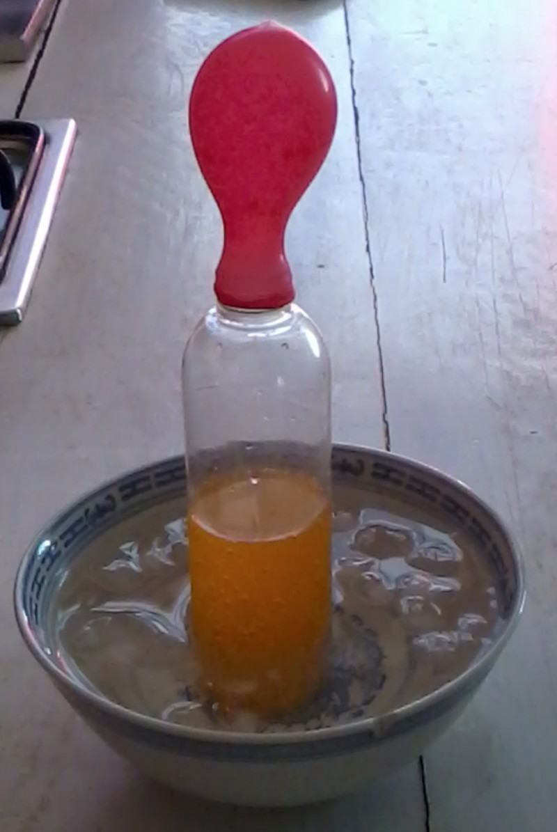 Break two effervescent tablets in two or three pieces and place them in the two balloons.
