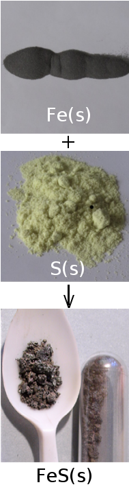 \(\text{Fe}(\text{s}) + \text{S}(\text{s})\) \(\rightarrow\) \(\text{FeS}(\text{s})\)
