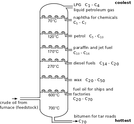 It is possible to separate the products of hydrocarbon cracking and obtain specific products from a crude oil mix through a process called fractional distillation. This is done using a fractionating column. Crude oil evaporates when heated to \(\text{700}\)\(\text{°C}\). The gas bubbles through a tray that is kept at a certain temperature. The alkanes and alkenes that condense at that temperature will then condense in the tray. For example if the tray is kept at \(\text{170}\)\(\text{°C}\) the product will be paraffin oil (see figure below).
