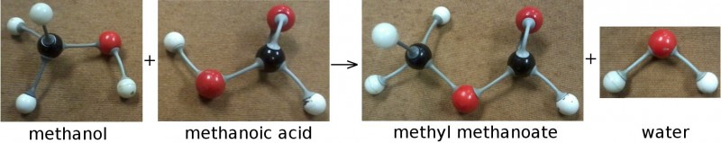 The esterification process of methanol and methanoic acid to methyl methanoate and water, shown with three-dimensional model kits.