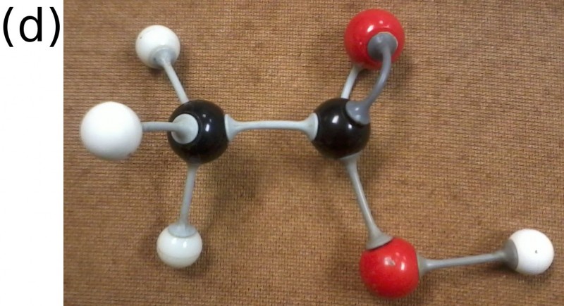 The (a) structural, (b) condensed structural and (c) molecular formula representations of ethanoic acid. (d) An atomic model of ethanoic acid.