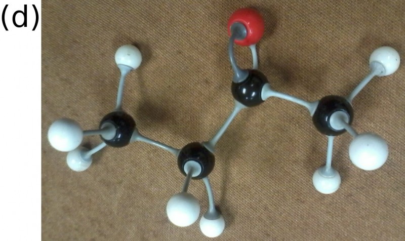The (a) structural, (b) condensed structural and (c) molecular formula representations of butanone. (d) An atomic model of butanone.