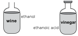 Ethanoic acid can be produced through the oxidation of ethanol upon exposure to the oxygen in air. This is why wine that is left too long can taste acidic. Wine can easily go sour if exposed to the oxygen molecules (\(\text{O}_{2}\)) in the air, especially if the weather is warm.