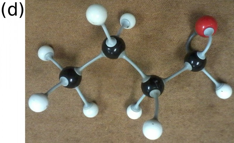 The (a) structural, (b) condensed structural and (c) molecular formula representations of butanal. (d) An atomic model of butanal.
