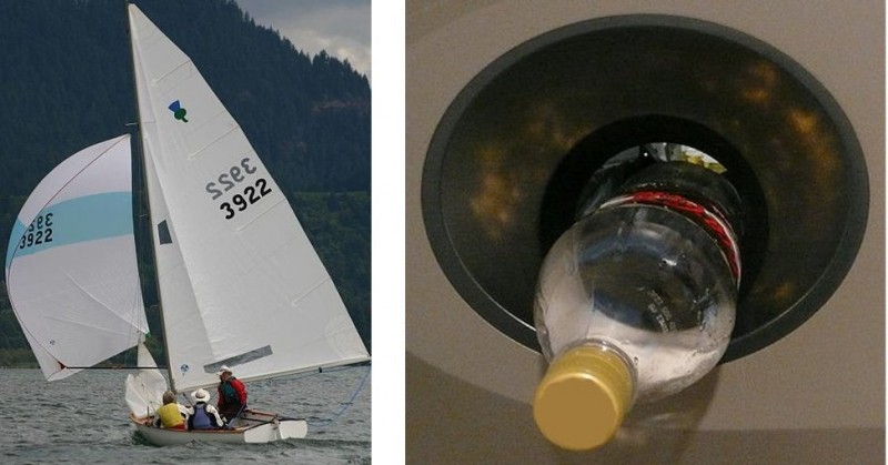 A collection of products made from polyethylene terephthalate: sailcloth and plastic squeeze bottles.