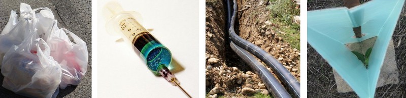 A collection of products made from polyethylene: plastic bags, a syringe, pipes, a plastic tree guard.