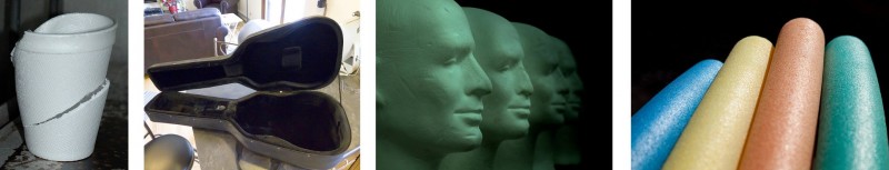 A collection of products made from polystyrene: a cup, a guitar case, polystyrene carvings, and floating pool noodles.