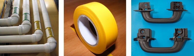 A collection of products made from polyvinyl chloride: pipes, electrical tape, and car parts.