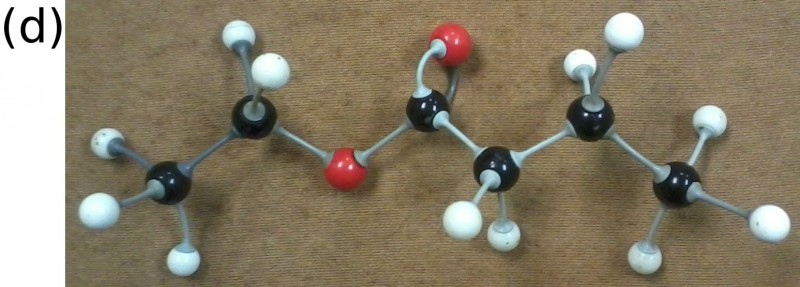 The (a) structural, (b) condensed structural and (c) molecular formula representations of ethyl butanoate. (d) An atomic model of ethyl butanoate.