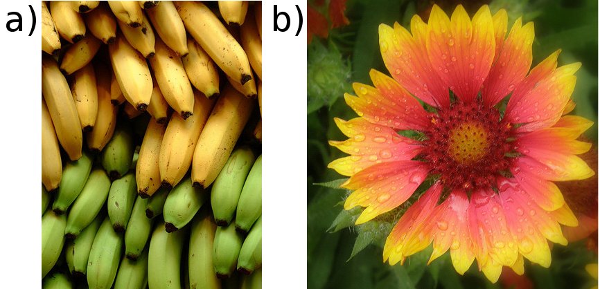 (a) Unripe (green) and ripe (yellow) bananas and (b) a flowering plant.