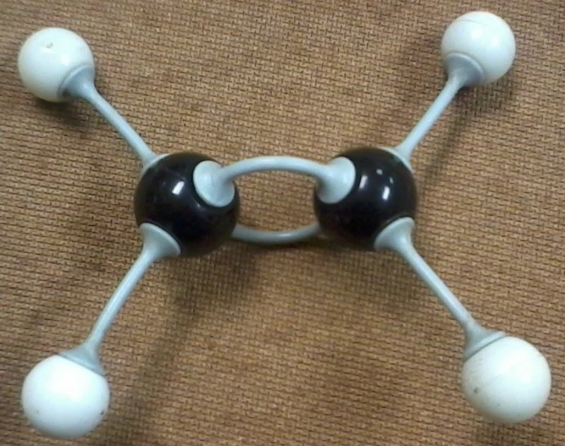 In the alkenes there must be at least one double bond between two carbon atoms. This means that they are unsaturated and are more reactive than the alkanes. The simplest alkene is ethene (also known as ethylene), which is shown in the figure below.