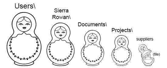 When looking for a specific folder or file, it is helpful to follow the file path. The file path tells you what folders to click on to get to the file. Read it left to right to show what folders to click on to get to the file; read it right to left to show which folders are nested in each folder.