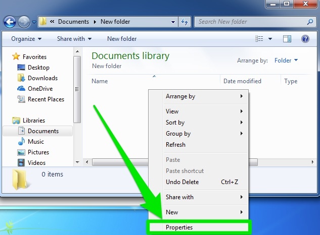 The screenshot shows a folder in Windows 7 called New folder. The file path for this folder is C:\Users\user\Documents\New folder. The user could click Documents to go up one folder to the Documents folder, and the small double-arrow on the left to go up to higher folders such as user.