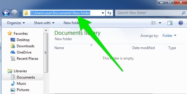 Toolbar MethodFor example, the screenshot below shows a folder in Windows 7 called New folder. The file path for this folder is C:\Users\user\Documents\New folder. In the screenshot below, the user could click Documents to go up one folder to the Documents folder, and the small double-arrow on the left to go up to higher folders such as user.