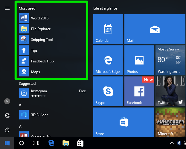 In Windows 7 and older operating systems, the most frequently used programs are listed in the left section of the Start menu, with the folder All Programs near the bottom-left corner. The All Programs folder leads to every program installed on the computer. Windows 10 does not have the All Programs folder, but instead lists all programs on the left section of the start menu, with the most used at the top.