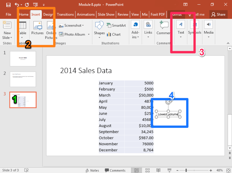 Another type of edit you may wish to perform on a presentation slide is to add a text box. Text boxes are used for emphasis or as supplements to the standard layout space. For example, perhaps you want to draw attention to a specific feature on an image or in data. An easy way to do this is with a text box.