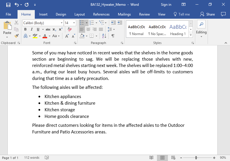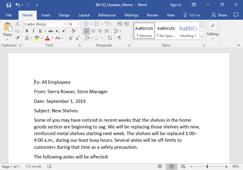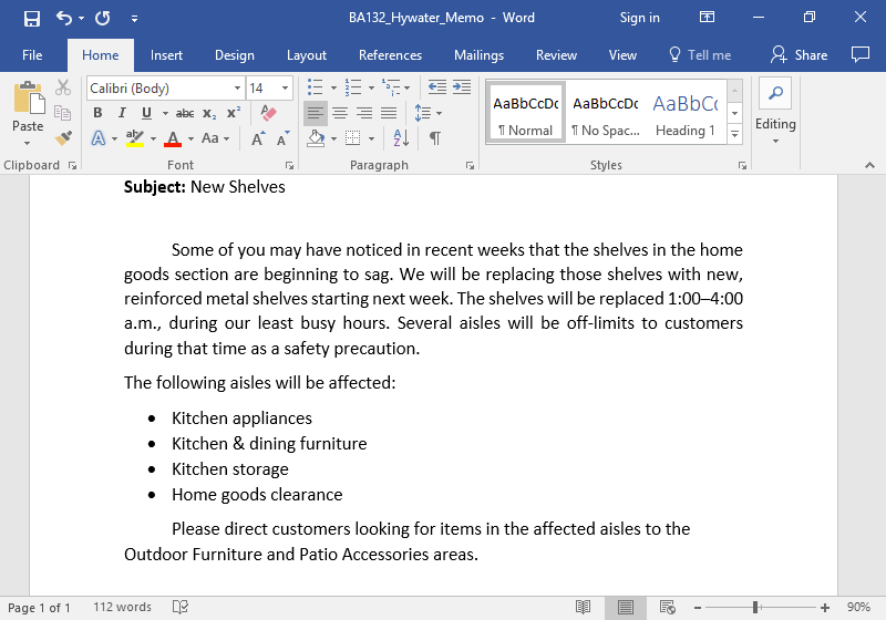 - Save the document to the Rowan folder on your desktop as BA132_LastName_Memo.docx, replacing “LastName” with your own last name. (Example: BA132_Dickson_Memo) It is a good idea to save your work periodically.