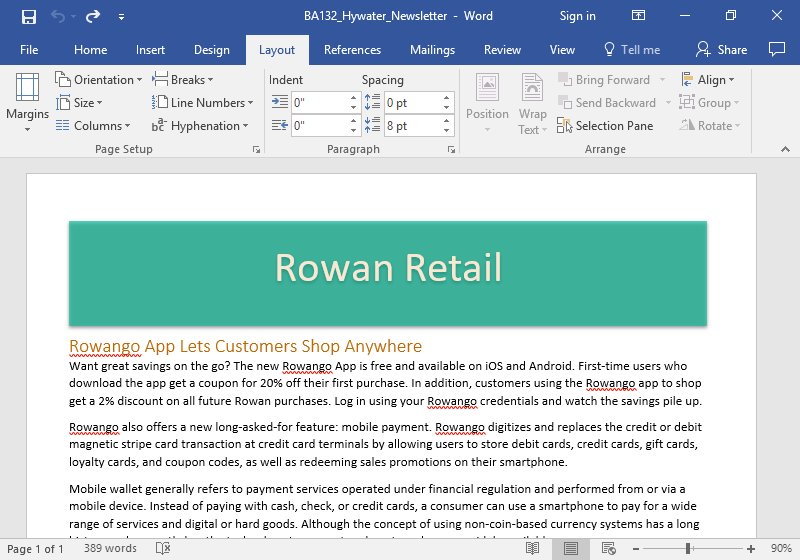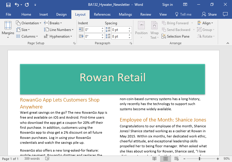 - Save the file to the Rowan folder on your desktop as BA132_LastName_Newsletter.docx, replacing “LastName” with your own last name. (Example: BA132_Abayomi_Newsletter) If you opened the template through Word, remember to select Save As and change the file extension to .docx. It is a good idea to save your work periodically.