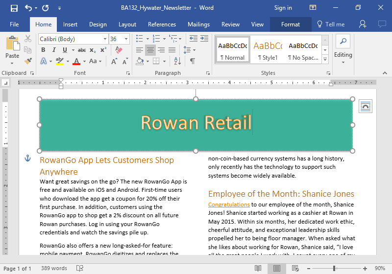 - Apply at least one text effect (out of Outline, Shadow, Reflection, or Glow) to the words “Rowan Retail” at the top of the newsletter. Be sure the words are still readable in the text box.