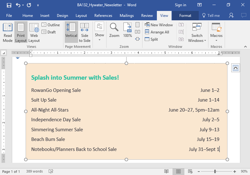 - Add a right tab stop to the sales in the “Splash into Summer with Sales!” text box. Right-align the dates of the sales to 7 inches.