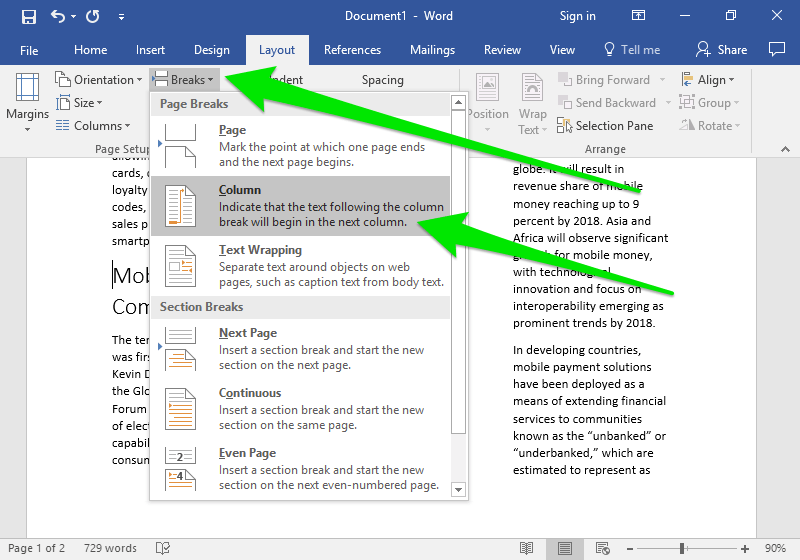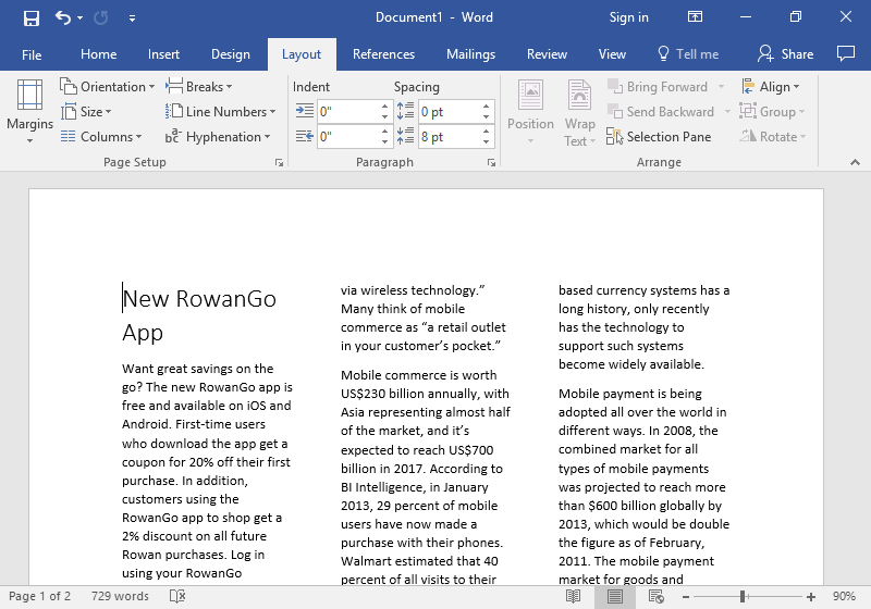 Adding a column break will end the column and send text to the next column. Note that a column break is tied to the location within the text, not the location on the page. Putting a column break before the Mobile Commerce headline will put a column break before the Mobile Commerce headline, regardless of how much text comes before or after the Mobile Commerce headline.