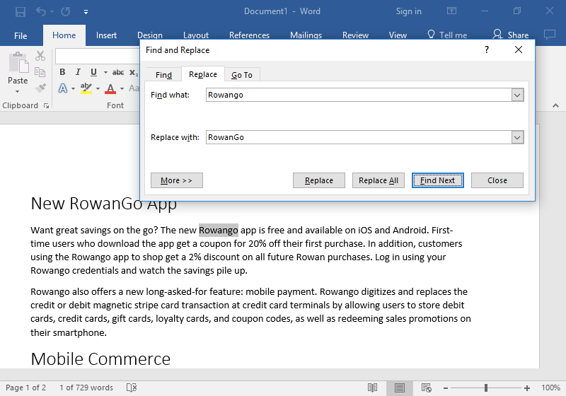 Replace All. Notice that every instance of Rowango has been replaced with RowanGo. (highlighting added for this course and not part of the document)