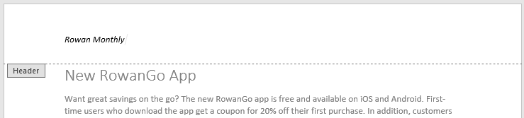 The header/footer will be represented by a dotted line. While in header/footer mode (when the dotted lines are visible), you cannot edit the main text. You can go back to editing the main text by selecting the Close Header and Footer option on the right side of the ribbon.