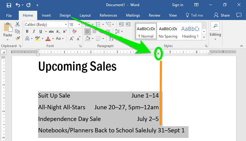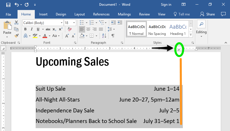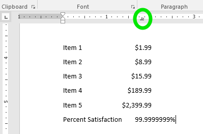 The tab stop is represented by the icon in the ruler. In the screenshot above, the right tab is marked with a green circle. Notice that the lines below are right-aligned with the tab stop, with the exception of the last line. The last line is not aligned because the line is too long for the text to fit with the right-align.