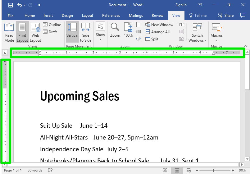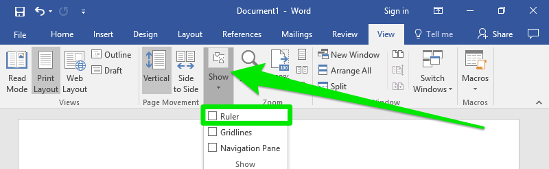 First, make the ruler visible (if it isn’t visible already). Go to View>Show and check the Ruler box.