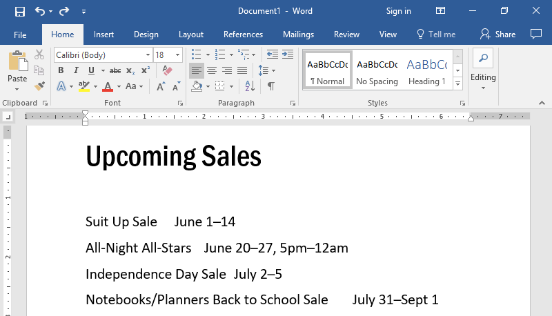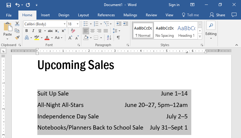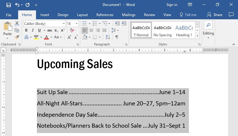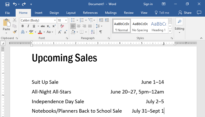 You may recall from Alignment, Justification, and Indentation that hitting the Tab key indents a paragraph. Each hit of the Tab key inserted a tab space. By default, a tab space stretches to fit the next 1/2 inch interval on the page. Tab stops control the width of a tab space so that it can be greater or less than 1/2 an inch.