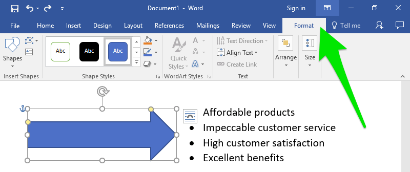 Once you select a shape, click and drag to draw the shape. You can then apply a text wrap, rotate the shape, or send the shape in front of or behind text.