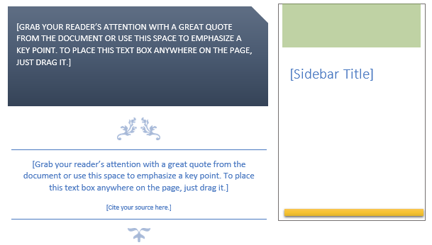 To add a textbox, go to Insert>Text>Text Box. There are a few pre-created Built-in options to choose from. Click one of the Built-ins to add it to the document. You can also draw your own by choosing Draw Text Box, then clicking and dragging where you want the text box to be.