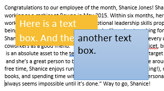 The yellow text box has been brought to the front, while the blue text box has been sent to the back.