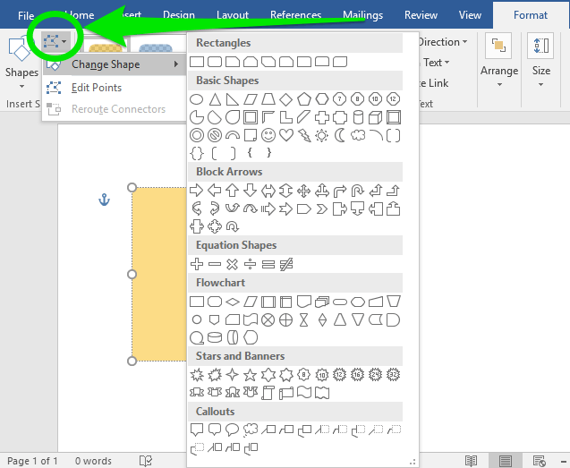 The Shapes group (at the far left) allows you to change the shape of the text box. Click the Change Shape button in the Shapes group and then Change Shape to see a dropdown menu with many shape options. Click an option to apply it to the text box.