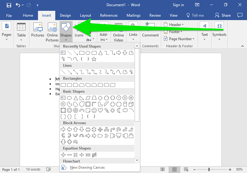 To insert a shape, go to Insert>Shape and select a shape from the menu.