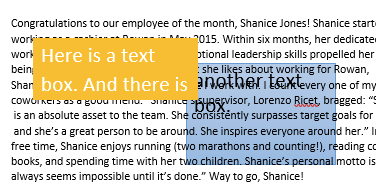 Things in a Microsoft Word document that are not text are called “objects.” The first object we will cover is a text box. Many of the controls and features of text boxes are also applicable to images, another important object in Microsoft Word.