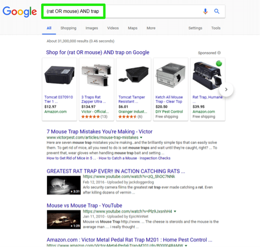 On your computer web browser, you type (rat OR mouse) AND trap into the search box. Google now retrieves its results which contain the word mouse or rat together with the word trap.