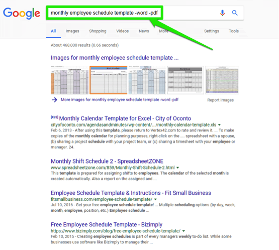 The search results include everything, Word templates, Excel templates, PDF format, etc. Now you realize that and Excel template is what you need and not the other options. Modify your search terms to now read monthly employee schedule template -word -PDF and press the Enter key. The search results will now eliminate any result containing Word or PDF in them. Make sure there is no space between the minus sign and the word you want to eliminate from the results.
