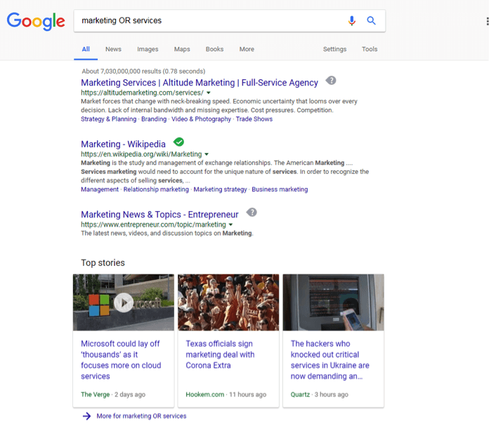 Next is the OR operator. In the Google search bar, type in the next search using OR. For this example, the search will be marketing OR services. This results page has even more results with over 7 billion possibilities! That’s far too many to search effectively. Time to try another Boolean operator to narrow those results further.
