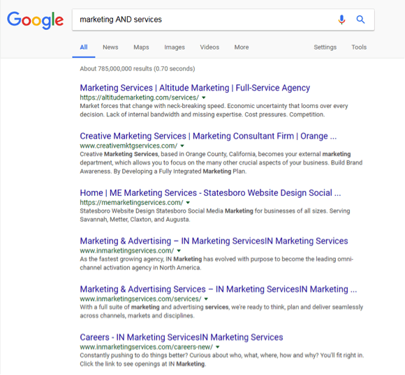 First we’ll start with AND. After a browser is open and the Google search bar is available, type in the search you want. For this example, the search will be marketing AND services. Look at the page from the search and note the amount of search results. There are over 785 million search results! What happens if the OR operator is used next for the same search? Does it increase or decrease the results amount? Let’s find out.