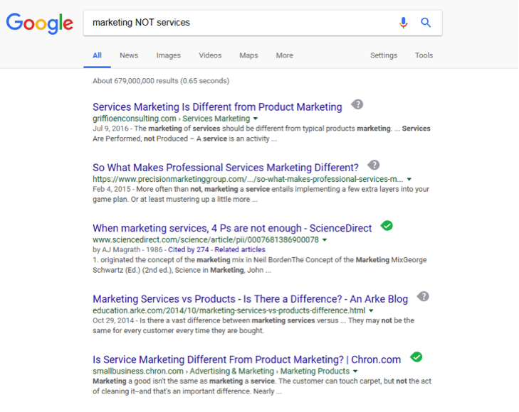 Last is the NOT operator. With the browser window open, type the same search using the operator NOT in the Google search bar. For this example, the search will be marketing NOT services. The results page now has fewer results with 679 million. That is still a huge number of results. The search results still may not be narrow enough so other methods can be used to reduce the number to a more reasonable amount. Now let’s explore other ways to narrow a search.