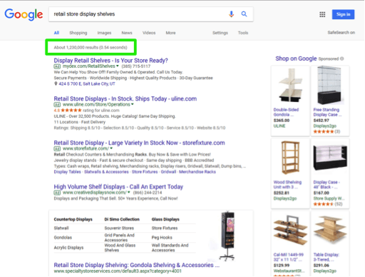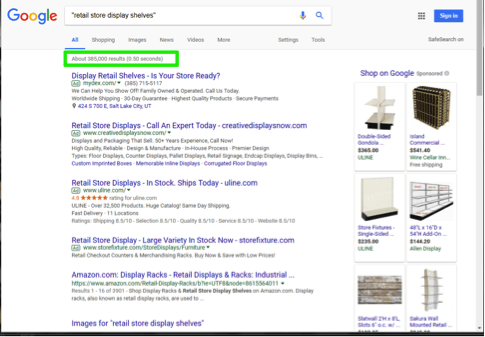 The results for the first search are over 1.2 million! That number is far too many to tackle for this search. A smaller number would be more effective. It’s time to narrow the search results. This can be accomplished by enclosing the search between quotation marks. Type “retail store display shelves” into the Google search box and notice the amount of search results with that exact phrase. The search results are now 385,000. That is far fewer than the original one million plus!