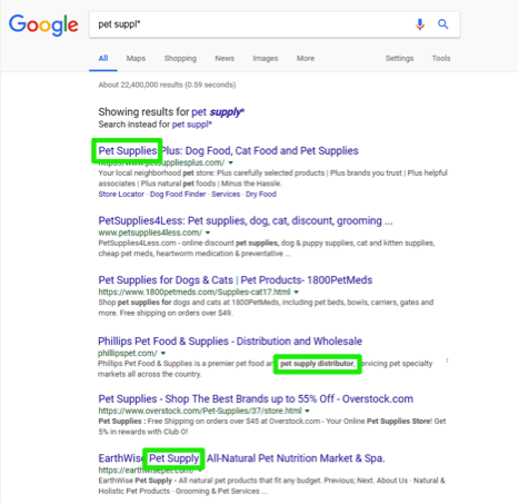 What if your employee at Rowan Retail needs to conduct a search for pet supplies, pet supply stores, pet suppliers and more? The asterisk is the Boolean modifier to use. Try the search pet suppl* in the Google search bar. The search results include all of the various aspects of the search the employee needed.