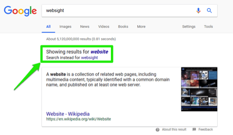 - A misspelled or mistyped search word. If you type website instead of websight or you type internet instead of intermet, search results can be a bit off because of the misspellings. Sometimes there will be no results at all. Be sure to check your spelling when running a search. Google tries to help by making suggestions like this one: