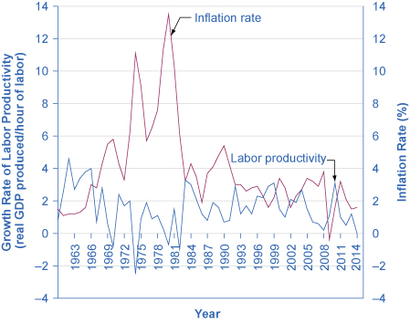 Over the last several decades in the United States, there have been times when rising inflation rates have been closely followed by lower productivity rates and lower inflation rates have corresponded to increasing productivity rates. As the graph shows, however, this correlation does not always exist.