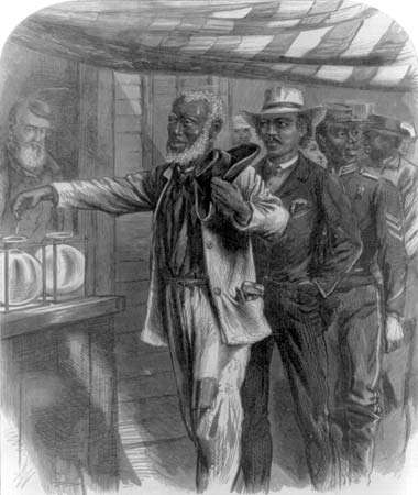 The First Vote, drawing by A.R. Waud, 1867, depicting African Americans voting for the first time in the United States.
